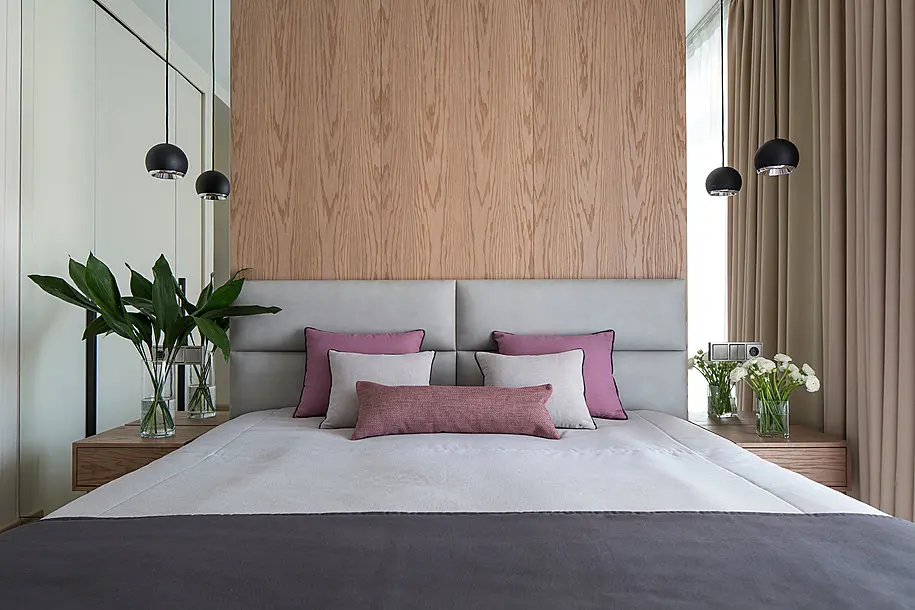 In dormitor, vom gasi aceeasi amplasare a oglinzilor, de o parte si cealalta a patului, pe mijloc peretele fiind placat cu lemn. Decorul este elegant amenajat, fara a omite nicio clipa functionalitatea. Si aici vom gasi dulapuri inalte precum cele din hol, dar si un corp folosit pe post de comoda si birou, prin prelungirea blatului spre fereastra. Desi spatiul este mic, amenajarea asigura confortul necesar, fara a aglomera incaperea.