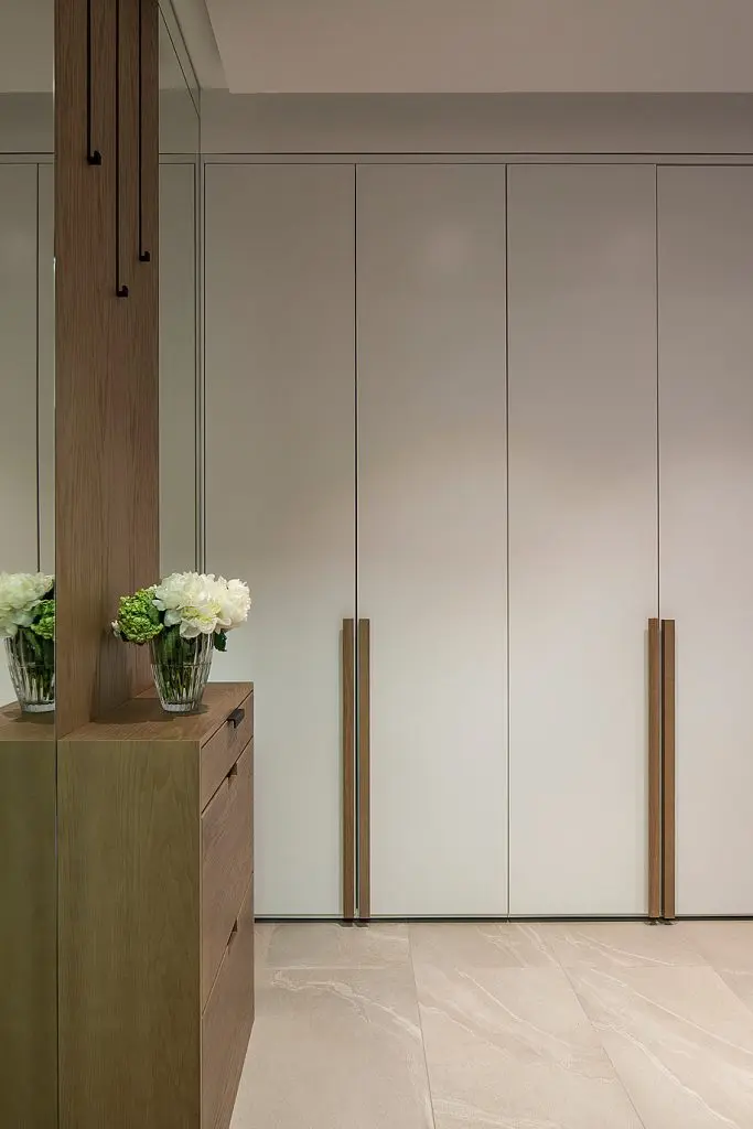 Principala zona de depozitare o vom gasi in hol, unde, pe un intreg perete au fost amenajate dulapurile. Oglinzile montate de o parte si cealalta a pantofarului si pe toata inaltimea peretelui creeaza impresia de largire a spatiului.