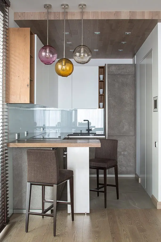 Spatiul destinat bucatariei este destul de restrans. Intr-o nisa a fost incastrate spatii variate de depozitare, iar electrocasnicele incorporate pentru a spori unitatea amenajarii. Designul este simplu, cu suprafete lucioase, iar blatul tip bar separa bucataria de restul incaperii. Finisajele sunt de inalta calitate, iar executia exemplara. Urmareste doar detaliile de la nivelul pardoselii, a tavanului fals unde sunt inserate spoturile sau corpul de mobilier destinat suporturilor de vinuri.