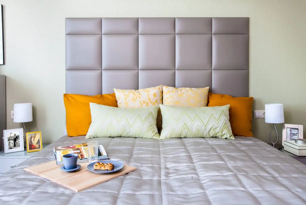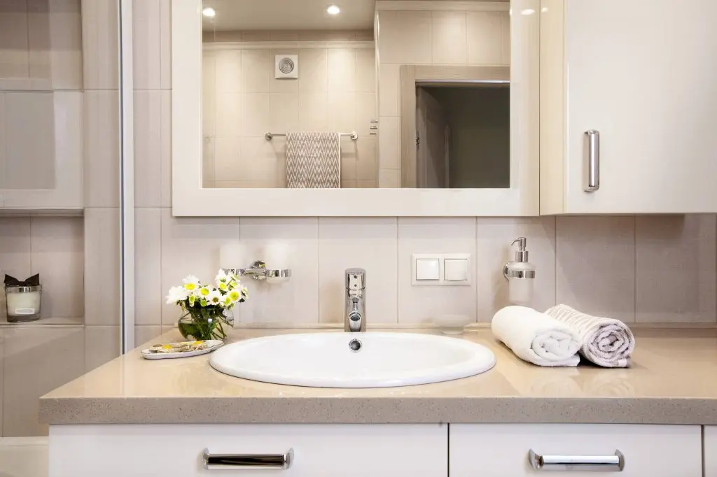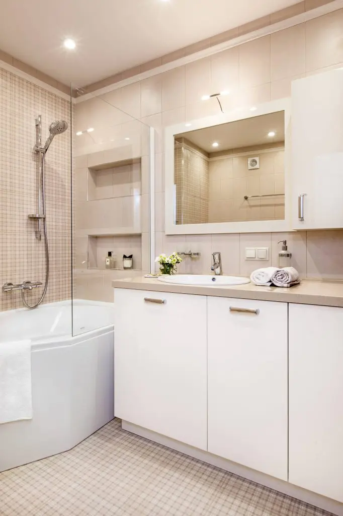 Pentru dormitor a fost conturata o amenajare calda, placuta si odihnitoare. Peretele-accent din dreptul patului a fost conturat cu un verde pastel, iar restul spatiului ramane neutru cu griuri colorate, crem, alb si nuante de lemn. Tablia tapitata cu care este completat cadrul patului ofera un plus de confort atunci cand iti doresti sa citesti sau doar sa te sprijini. Dimensiunile dormitorului au permis si integrarea unui dressinggeneros dar si a unei comode. Si in baie, amenajarea urmeaza latura functionala, cu crem si bej ca elemente cromatice predominante alaturi de alb. Spatiile de depozitare sunt integrate in zona de sub lavoar, dar le regasim si la nivelul celor doua nise create in dreptul cazii.