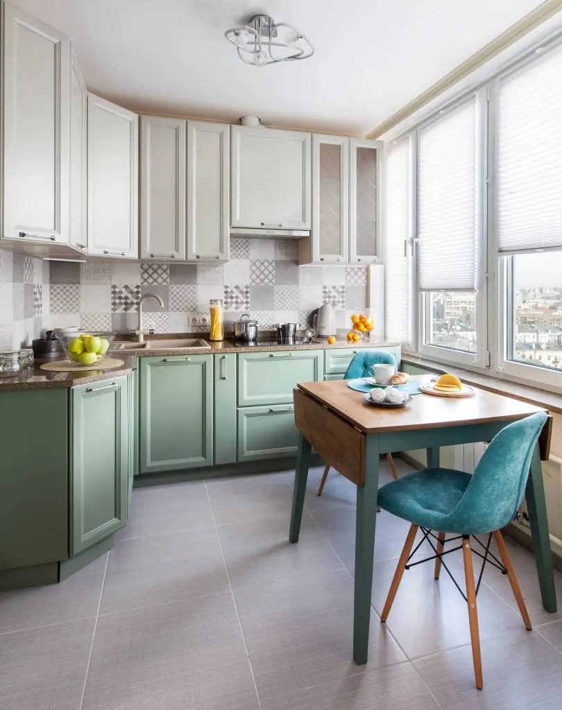 In bucatarie, amenajarea este gandita cat mai functional posibil. Mobilierul este dispus pe ambele laturi ale incaperii optimizand spatiile de depozitare. In acelasi scop, dulapurile sunt inalte, mergand pana in tavan. Pentru frontul corpurilor principale a fost ales un verde-menta, iar pentru cele suspendate un alb murdar pentru a pastra luminozitatea camerei. Combinatia de culori este placuta si potrivita pentru o bucatarie, la fel si alegerea placilor decorative pentru braul dintre piesele de mobilier. Electrocasnicele sunt incorporate pentru a pastra caracterul unitar al amenajarii si pentru a mai castiga spatiu. Locul destinat meselor preia turcoazul din living, iar masa este extensibila pentru momentele cand sunt musafiri.