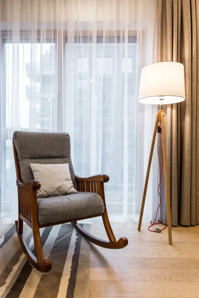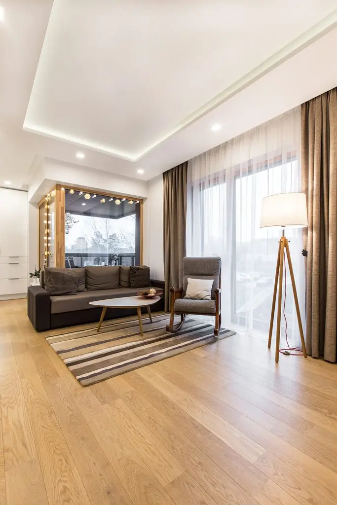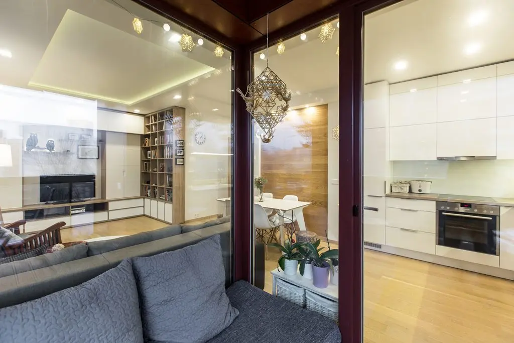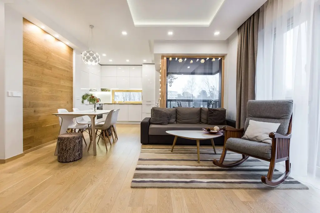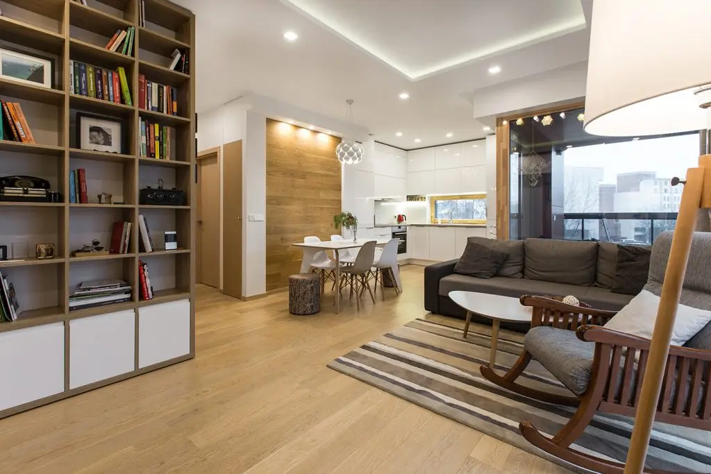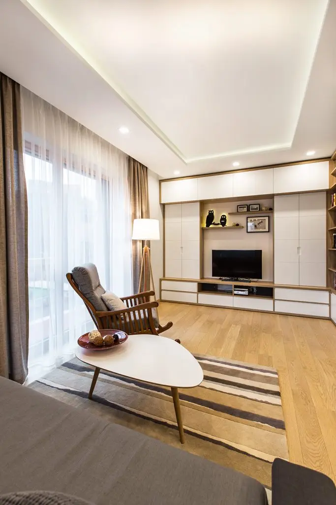 Zona de zi este un spatiu privilegiat in acest apartament. Functiunile se inlantuiesc armonios si permit circulatii firesti in interiorul camerei. Fotoliul-balansoar alaturi de lampadar compun un minunat loc de lectura, iar diningul face o trecere discreta spre zona bucatariei; pentru a scoate in evidenta acest spatiu, peretele din dreptul mesei este placat cu lemn.