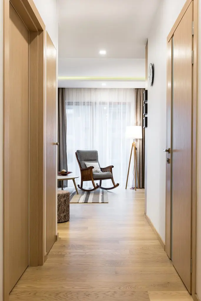 Dressingul cu usi acoperite cu oglinzi lasa impresia ca spatiul pare mai mare, un truc excelent integrat in acest spatiu restrans al holului.