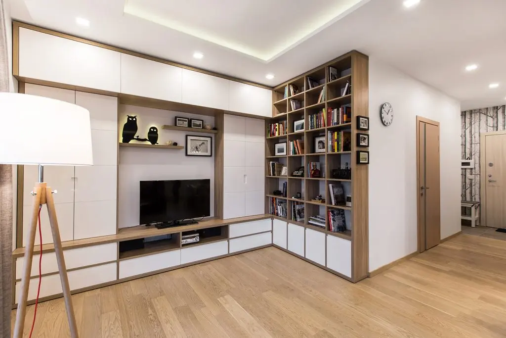 Spatiile de depozitare, o problema des intalnita in apartamentele de bloc, sunt dispuse sub diferite forme; corpurile din living formate din dulapuri si sertare, precum si un corp separat de biblioteca incastrat intr-un soi de nisa.