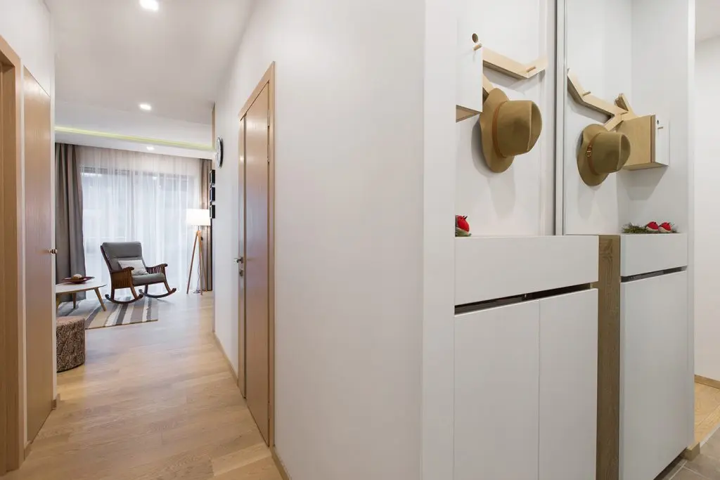 Balconul a fost gandit ca un fel de prelungire a livingului in exterior, unde poti petrece timp in zilele sau serile calduroase si nu numai. Tematica naturii o regasim si in hol prin tapetul cu mesteceni amenajat pe peretele cu usa de la intrare sau prin cuierul traforat in forma de creanga.