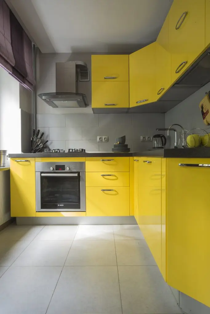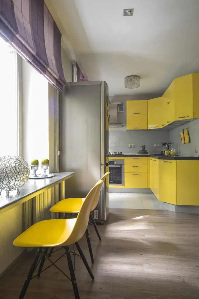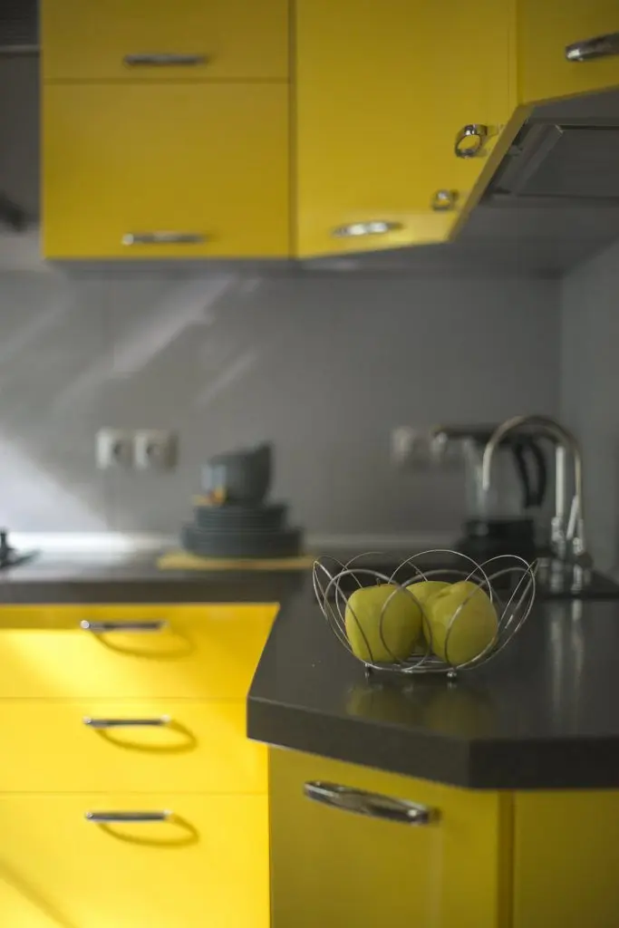 Trecerea spre bucatarie se face direct, locul de luat masa fiind amenajat la fereastra ca o zona de bar. Cele doua scaune galbene tip Eames reusesc sa atraga privirea, fiind un soi de piese-accent care sa puna in valoare aceasta mica functiune. In spatiul dintre cele doua ferestre, a fost asezat frigiderul. Configuratia in forma de L a bucatariei permite o utilizare optima, iar corpurile de mobilier asigura spatiile de depozitare necesare. Plita si cuptorul sunt incastrate in mobilier, iar hota este de sine statatoare. Frontul dulapurilor este galben, iar blatul si placile ceramice dintre dulapuri vin in doua nuante de gri, mai inchisa pentru blat si foarte deschisa pentru faianta. Tot in bucatarie a fost amplasata si masina de spalat rufe.