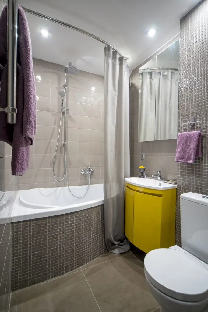 Spatiul destinat baii este unul mic si ingust, insa designerul a reusit sa integreze o cada, vas de toaleta si un lavoar cu depozitare sub el si deasupra printr-un dulap cu fatete acoperite cu oglinzi.