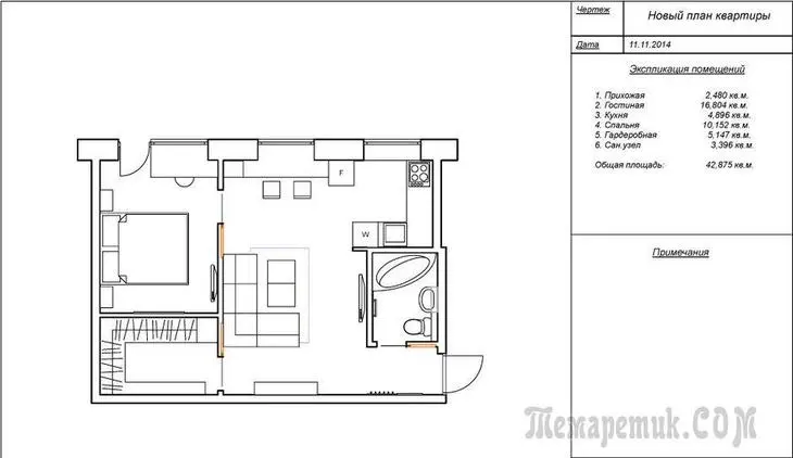 Noua configuratie rezultata este cea a unui apartament cu 2 camere, nedecomandat. Pentru a mai castiga spatiu s-a optat pentru usi glisante in locul celor batante.