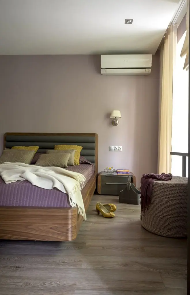 Pentru dormitor, s-a mizat pe o ambientare simpla, cat mai sumara. Patul este piesa principala, cu doua noptiere joase. Cadrul patului este prevazut cu o tablie tapitata pentru a spori confortul, iar peretele-accent vine intr-o nuanta de violet discreta, deschisa amintind de tematica utilizata.