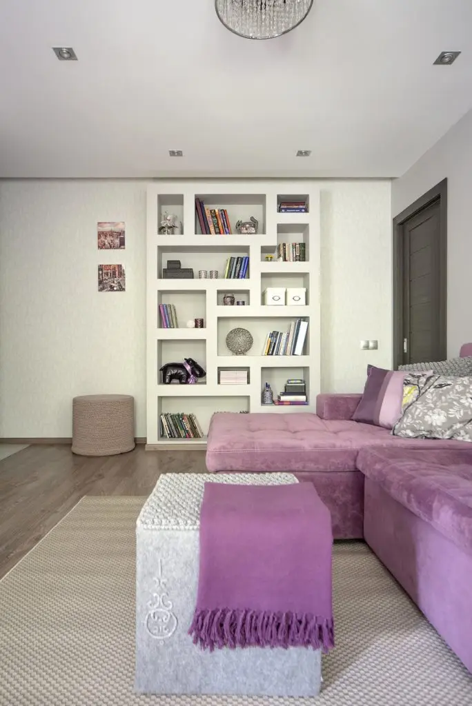 Accentele cromatice de galben si violet dinamizeaza decorul si ii confera un aer tineresc, modern. Culorile comunica coerent la nivelul amenajarii, violetul fiind prezent in diferite forme: materialul canapelei, draperiile romane, cuverturile sau dulapul din baie; in aceeasi masura galbenul echilibreaza tonurile reci si imprima caldura amenajarii.