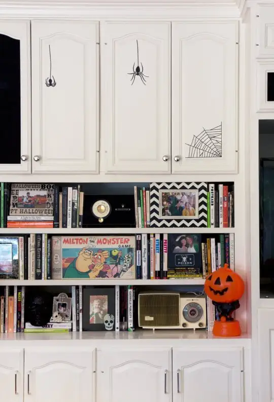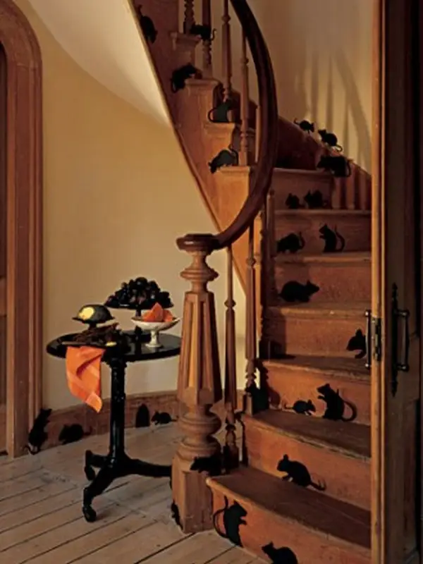 Si copiii va pot ajuta in amenajarea casei pentru Halloween: va pot decupa cateva modele de liliac pe care sa ii lipiti intr-un colt pe perete. Contrastul alb-negru va iesi cu siguranta in evidenta. La fel puteti proceda si cu cativa soricei decupati pe care sa ii lipiti in josul peretilor. Tineti pisicile deoparte, s-ar putea sa pice in capcana.