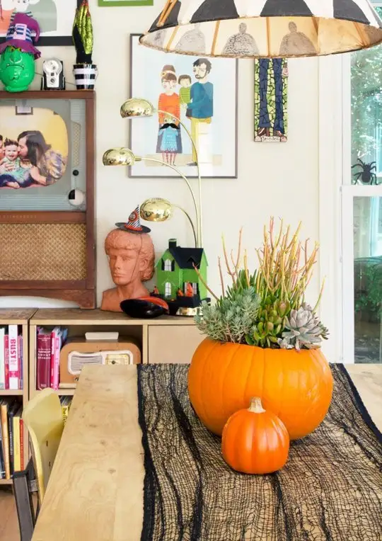 Pentru interiorul casei, puteti adauga din nou dovleci care sa functioneze ca ghivece pentru plante. Folositi o plasa neagra, usor uzata pe care sa o puneti pe masa sub dovleac; va fi un decor simplu dar de impact.
