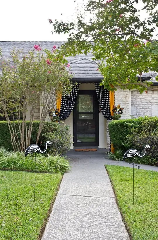 Si alte parti din casa pot fi decorate pentru a simti sarbatoarea la fiecare pas. Ii puteti intampina pe oaspeti chiar de la intrare cu cateva schelete amuzante de pasari flamingo si cortine in culorile Halloween-ului negru si portocaliu. Nu excludeti nici traditionalele sperietori de ciori sau dovlecii sculptati si luminati.