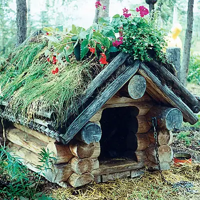 Casuta pentru caine de talie mica, cu gradina pe acoperis. De preferat a se construi pentru un caine caruia nu ii place sa isi roada plantele din curte sau de pe acoperis.
