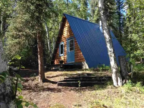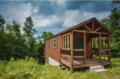 Casuta de 26 de metri patrati are un dormitor si o baie si a fost construita in anul 2010. Este inconjurata de jumatate de hectar de padure.