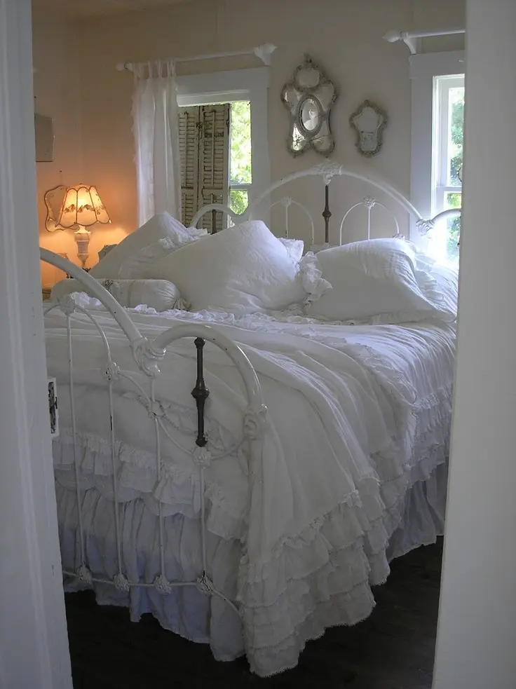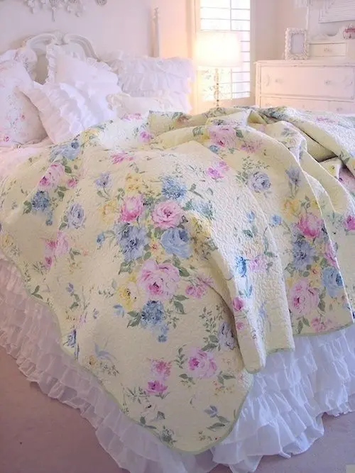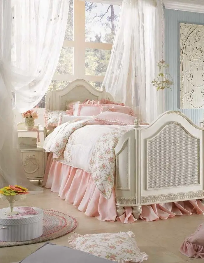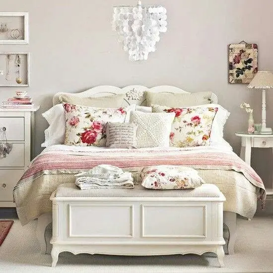 Textilele se regasesc intr-un amestec de texturi. Atentia se concentreaza asupra detaliilor, astfel, intalnim printuri florale si margini dantelate. Asternuturile sunt asezate intr-o eleganta ”sifonata”, iar perdelele sunt in nuante luminoase, cu un aspect plutitor, intim.Sunt folosite lampi cu abajur, candelabre elegante cu lumina calda pentru a crea ambientul intim si confortabil.