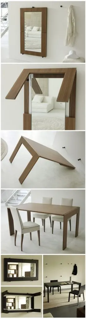In zona de dining se poate castiga spatiu chiar prin depozitarea elementului central al camerei – masa. Sunt situatii in care masa nu poate fi tinuta permantent pe podea. O idee cu adevarat ingenioasa este de a fixa blatul mesei pe perete impreuna cu picioarele rabatabile.