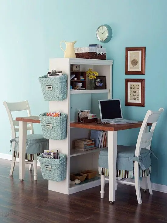 Atunci cand in casa este nevoie de doua birouri ele pot fi amplasate fata in fata si pot fi despartite de o mica bibilioteca. Bibilioteca deserveste ambele birouri, poate fi folosita si partea laterala a ei pe care sa se fixeze cosuri pentru sortarea hartiilor.