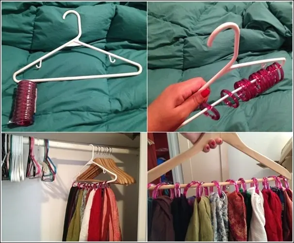 Pentru fularele si esarfele care se incurca mereu si niciodata nu o gasesti pe cea care iti trebuie, o idee foarte buna este umerasul “organizator” prevazut cu inele de la perdeaua de dus. Solutia este una practica si iti permite sa le vezi pe toate astfel incat sa poti alege rapid ceea ce ai nevoie.