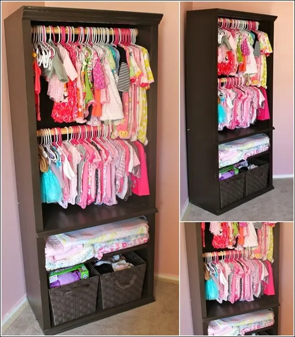 Pentru hainele copiilor poti folosi o biblioteca de care nu mai ai nevoie. Rafturile pentru carti sigur au marimea potrivita pentru a depozita hainele celor mici.