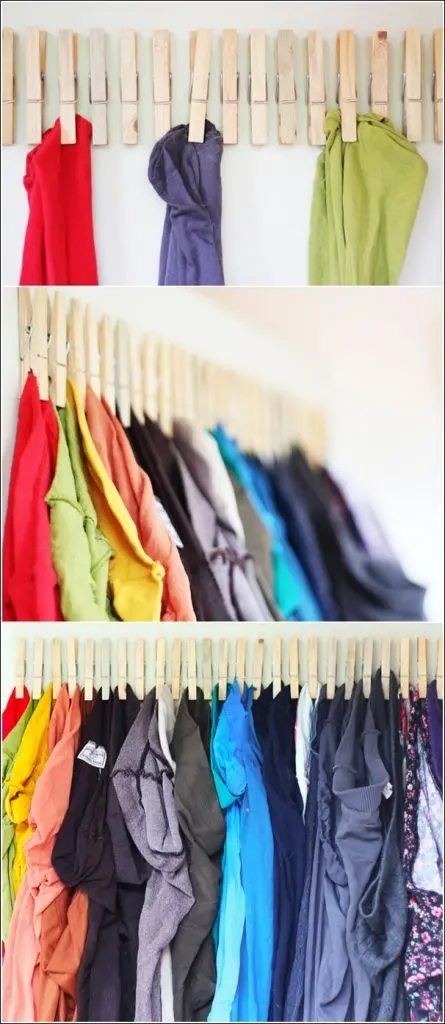 Clestii de rufe se pot folosi si pentru hainele uscate, nu doar pentru cele proaspat spalate. Ii lipesti de usa dulapului si tocmai ce ti-ai creat o metoda de organizare pentru haine.