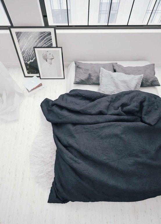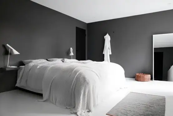 O amenajare dramatica a unui dormitor gri, accente de negru si mult alb pentru lumina spatiul