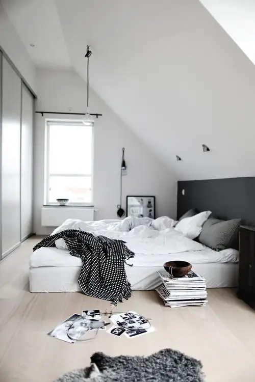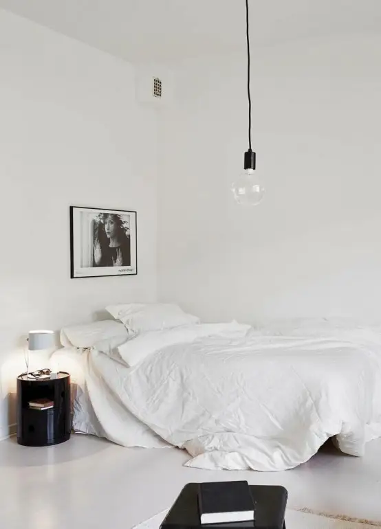 Dormitor in cel mai pur stil minimalist remarcati cat de putine elemente exista la nivelul spatiului