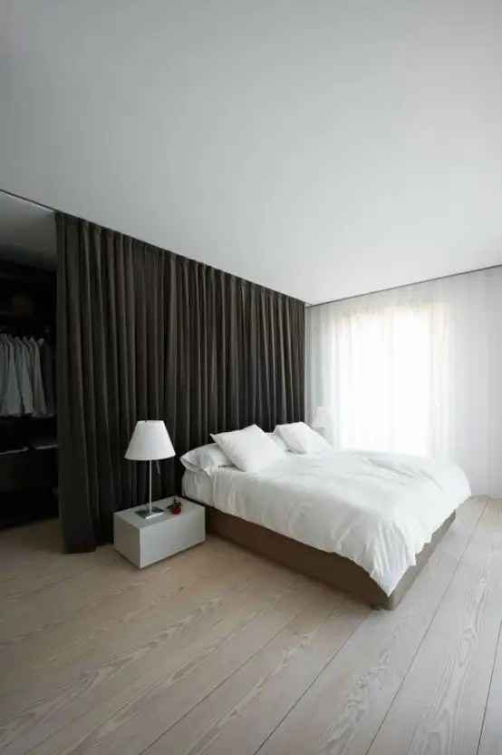 Amenajare de dormitor minimalist cu spatiu pentru depozitare in spatele patului. Dressingul este separat vizual de o draperie lunga, neagra.