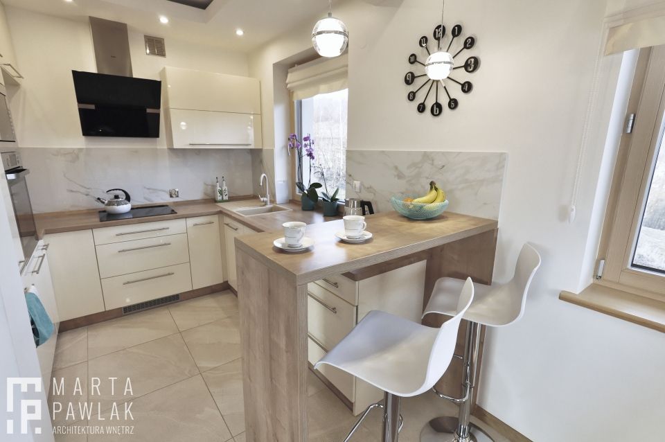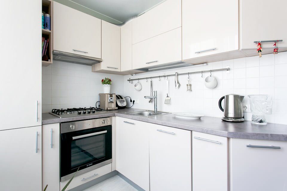 Model de amenajare alb predominant, o bara pentru ustensile, electrocasnice incastrate in mobilier.