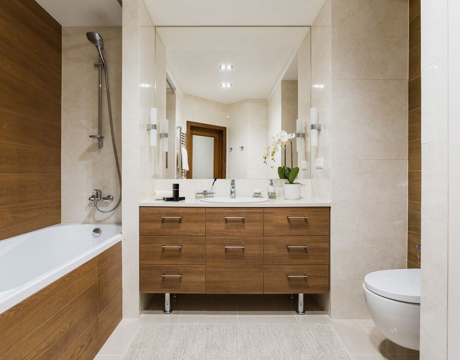 Poti adauga bejul ca nuanta de accent, cum ar fi insertii de placi ceramice care imita lemnul sau chiar lemn. Fie la nivelul pardoselii sau ca o placare a cazii de baie sau pentru a crea un perete-accent, nu vei da gres cu o astfel de abordare.