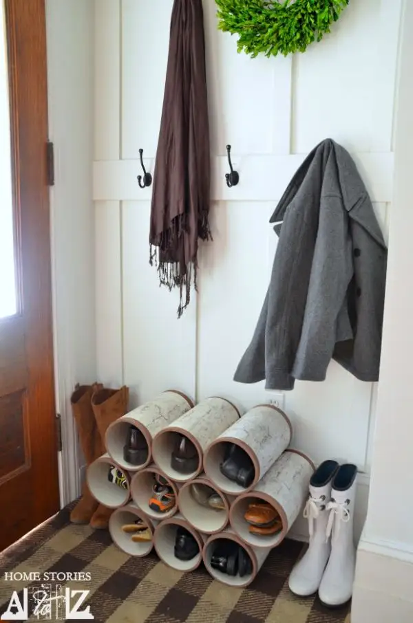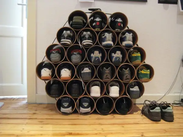 Tevile din PVC sunt o idee buna pentru un astfel de proiect. Un pantofar astfel creat nu numai ca va va organiza incaltarile dar va fi si o piesa centrala pentru hol. Nu alegeti tevi foarte mari ci cat sa incapa pantoful. Creati forme diferite, hexagon sau romb. Puteti folosi orice tip de tevi si sa le dati un design exterior interesant.