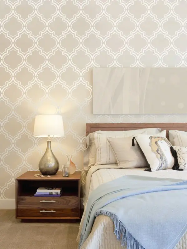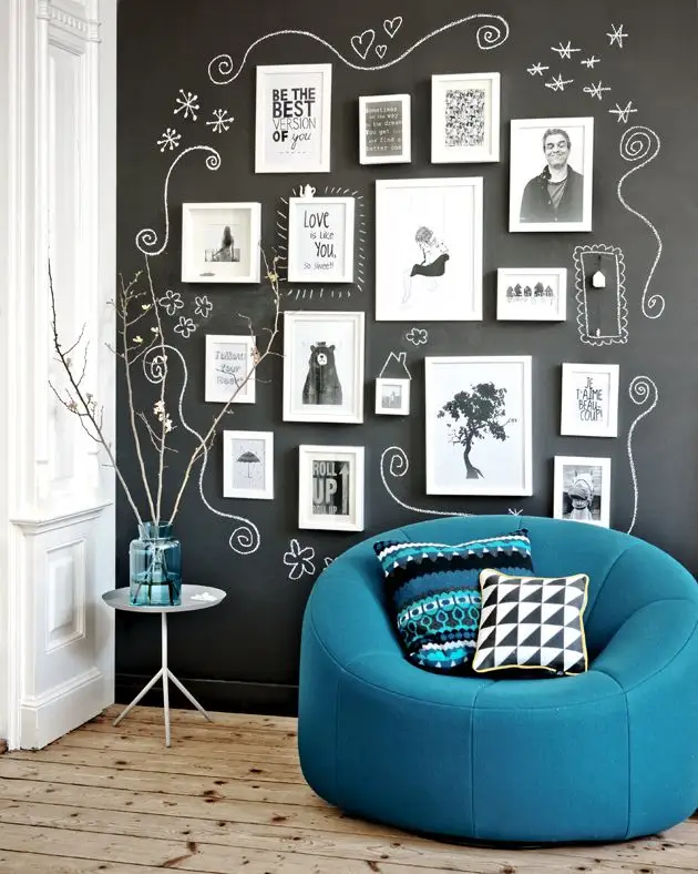Un tapet cu un model abstract sau pattern creat cu stencil(cu un sablon decorativ) este o idee interesanta de folosit pentru camera copiilor. Veti obtine un perete accent de exceptie cu vopseaua de tabla scolara in bucatarie, pe un dulap sau in camera unde se joaca copiii sau chiar in fata biroului. Veti putea scrie pe perete si desena in fiecare zi altceva.
