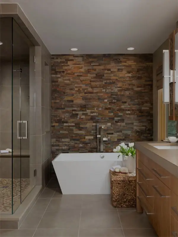 Creati un perete accent cu lemn. Puteti alege sa placati un intreg perete sau sa va limitati la nivelul tabliei de pat, daca ne referim la dormitor. Aceeasi idee poate fi pusa in aplicare si cu ajutorul pietrei. Un perete accent cu travertin va face din baia dumneavoastra una cu adevarat deosebita.
