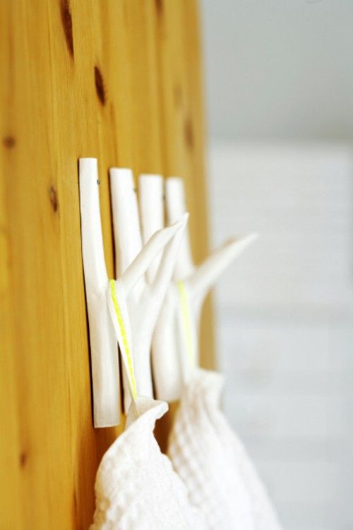 Alegeti din gradina sau din parc cateva ramuri de copac mai rezistente din care va puteti face niste agatatoare pe care sa puneti hainele. Dupa ce le taiati in marimea potrivita vopsiti-le in culoarea pe care o doriti si atasati-le pe perete sau pe o bucata de scandura care ulterior va fi agatata de perete.
