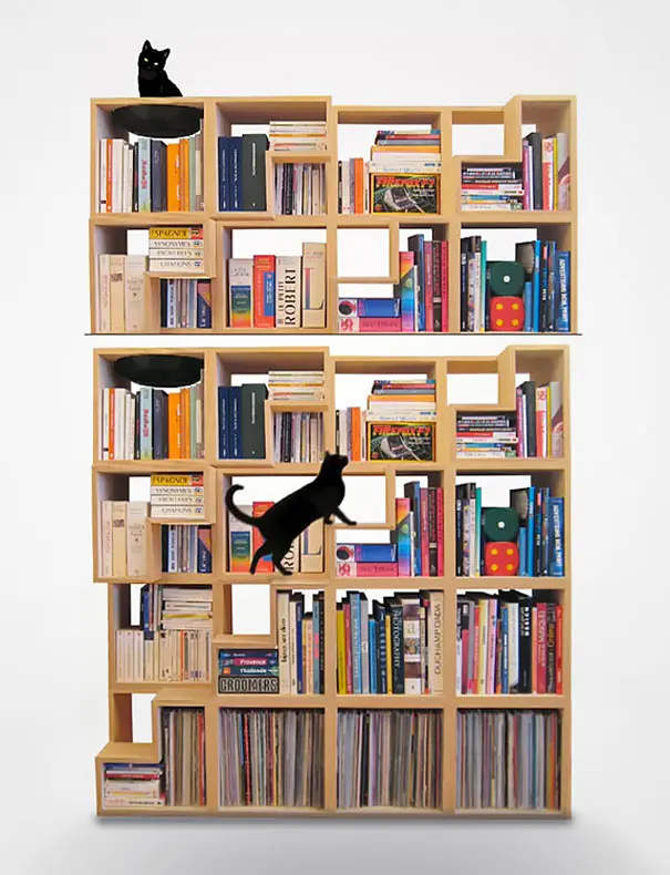 Raft modular pentru carti. Are integrate in mod inteligent niste trepte pe care pisicile se pot catara cu usurinta.