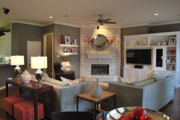 Pentru living, luati in considerare o aranjare intr-o forma rotunda. Astfel, plasati canapeaua, fotoliile sau scaunele circular, intr-o forma confortabila care sa inlesneasca conversatiile intre oameni. Apoi restul de mobila, ar trebui sa formeze niste bariere in jurul acestui cerc: dulapul sau etajerele pot fi dispuse de-a lungul peretilor.