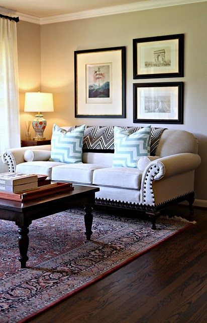 Mobila poate fi aranjata in living dupa regula triunghiului. Astfel, doua capete de masa, incadreaza canapeaua, iar deasupra ei se afla agatat un tablou. Aceasta metoda asigura simetrie si ofera suport pentru atunci cand raman zone pe care nu stim cum sa le amenajam.