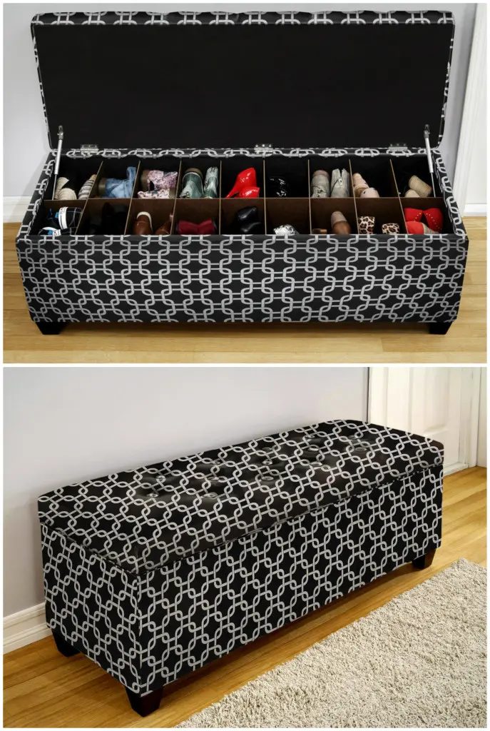 Bancheta cu spatiu pentru depozitare. Orice hol are nevoie de o asemenea bancheta. Pe langa faptul ca puteti depozita in ea incaltamintea, va puteti si aseza pe ea pentru a va lega la sireturi.