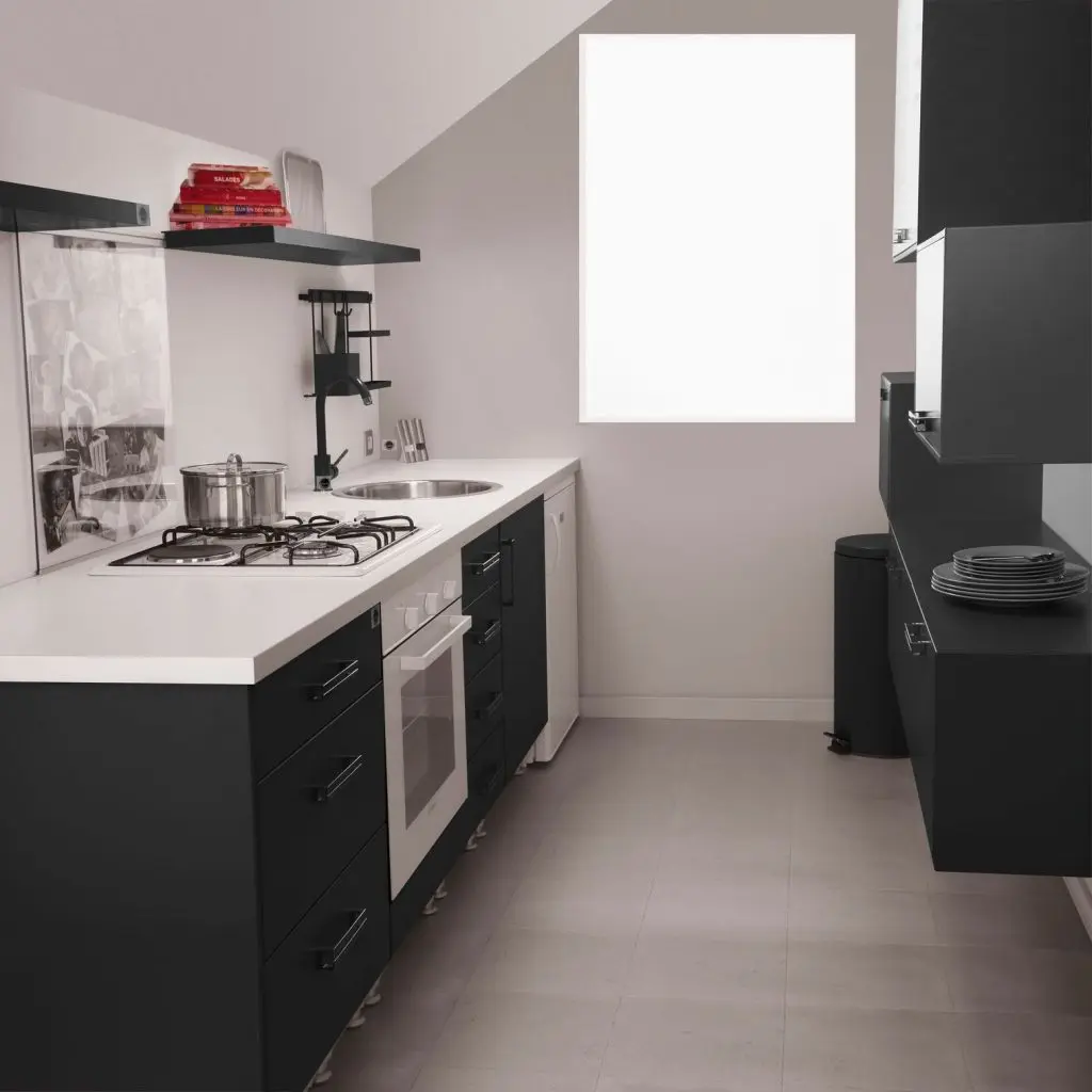Intr-o garsonierasau intr-un apartament tip studio, spatiul dedicat bucatariei este de cele mai multe ori foarte limitat. In acest caz, o chicineta compacta (eventual deschisa catre camera) dotata cu minimul necesar va fi solutia potrivita.