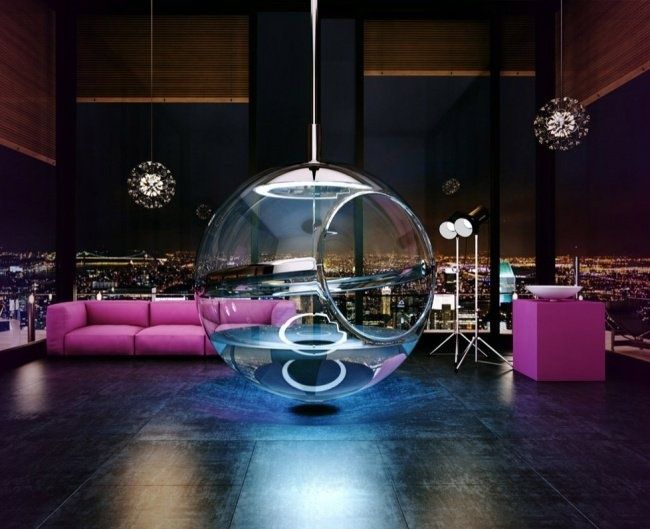Cada de baie sferica. Printre accesoriile decoprative pentru casa se numara si cada de baia sferica, transparenta, care poate fi agatata in mijlocul sufrageriei. Cu siguranta ca este un obiect de lux dar poate ca nu peste multa vreme va si accesibil oricui.