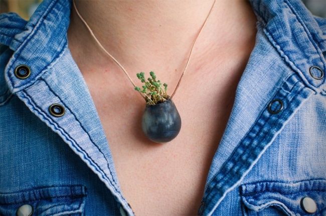 Bijuterii din plante. Aceste mici ghivece cu plante au fost special create pentru a fi purtate ca si bijuterii. Se pare ca natura este din nou la moda.