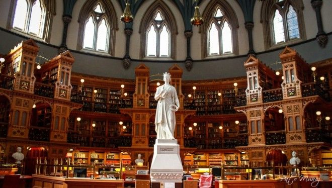 Library of Parliament, Ottawa, Canada: Biblioteca Parlamentului din Ottawa, Canada joaca un dublu rol, atat de biblioteca cat si de department de cercetare pentru Parlamentul canadian. Cladirea a fost ridicata intre anii 1859 si 1876 si a supravietuit unui incendiu in 1916. Arhiva bibliotecii consta in peste 6000.000 volume ingrijite de 300 de angajati.