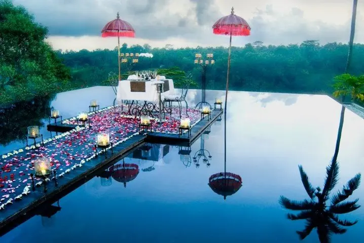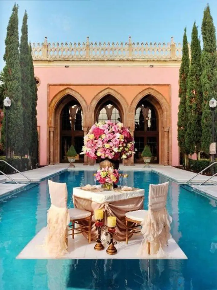 O masa in centrul piscinei este un cadru inedit in care poti savura o cina romantica.