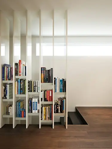 Idee de compartimentare a unui spatiu. Peretele este folosit ca spatiu pentru depozitare a cartilor sau a altor decoratiuni.