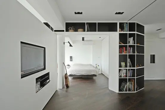 O idee foarte interesanta de compartimentare a unui spatiu mic. Aici biblioteca separa spatiul livingului de zona intima a patului.