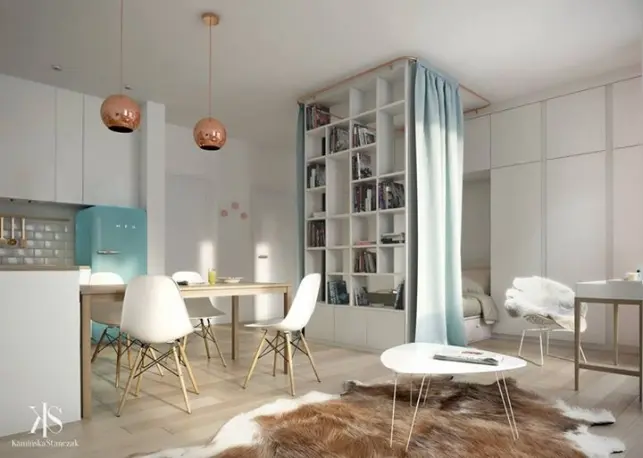 Deschide GaleriaDaca vorbim, de pilda, despre o garsoniera cu o suprafata destul de mare, care depaseste 35 de metri patrati, deja ne putem juca in timpul amenajarii cu cateva solutii de compartimentare pentru a ne asigura o intimitate a locului de dormit, pentru a separa cumva locul de luat masa de restul casei, sau bucataria de living etc.