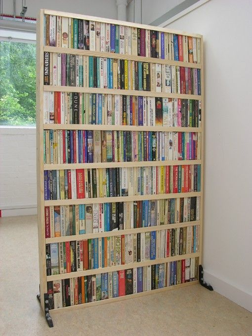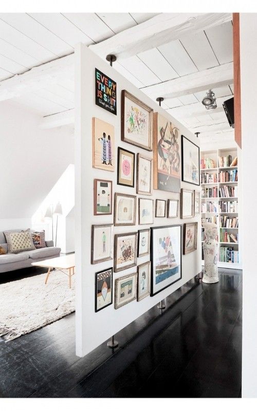 Idee de compartimentare a unui spatiu. Peretele este folosit ca spatiu pentru depozitare a cartilor sau a altor decoratiuni.