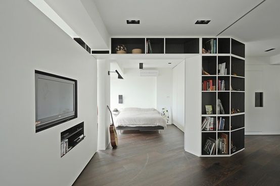 O idee foarte interesanta de compartimentare a unui spatiu mic. Aici biblioteca separa spatiul livingului de zona intima a patului.