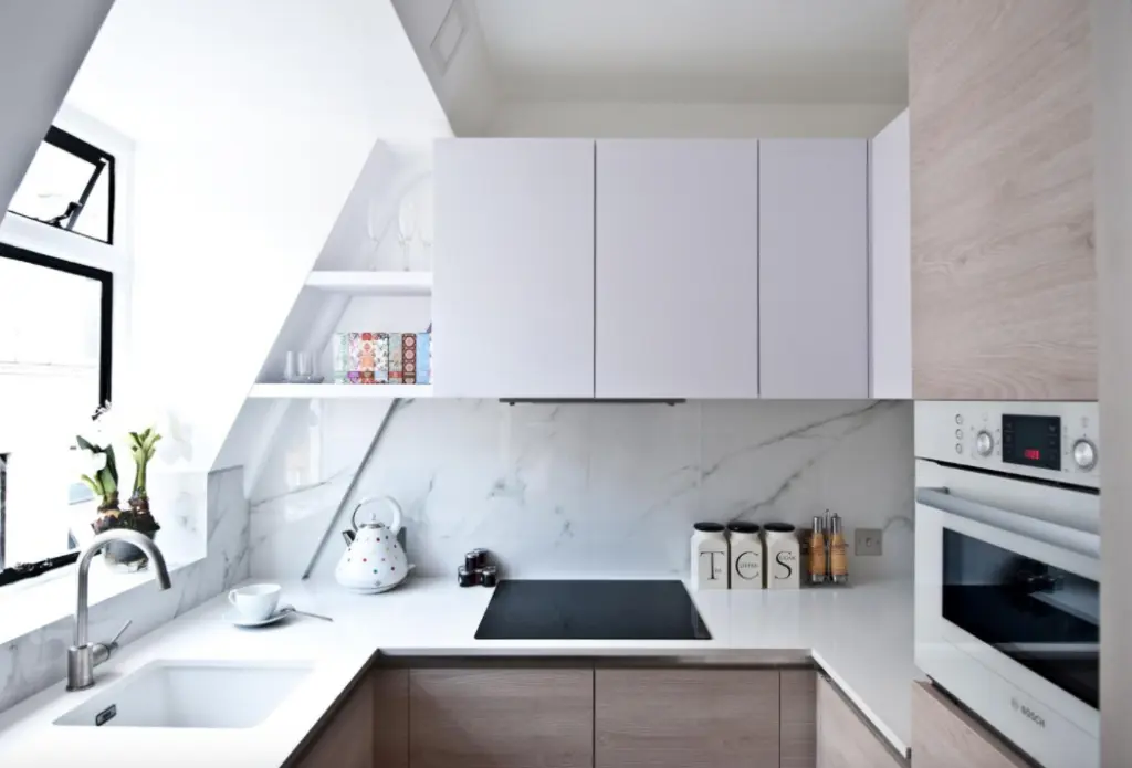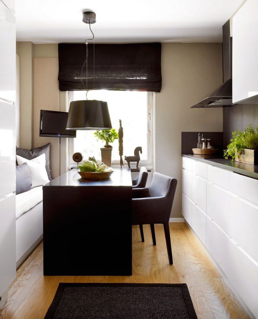 In ceea ce priveste dispunerea mobilierului,configuratiile in linie dreapta sau cele in forma literei L sunt cel mai des intalnite. Piese compacte, cu dulapuri care merg pana in tavan oferind astfel mai multa depozitare, sunt cele recomandate pentru a-ti oferi confortul necesar. Opteaza, in masura posibilitatilor pentru electrocasnice incorporate ca sa sporesti unitatea amenajarii.