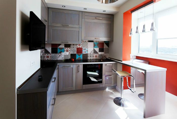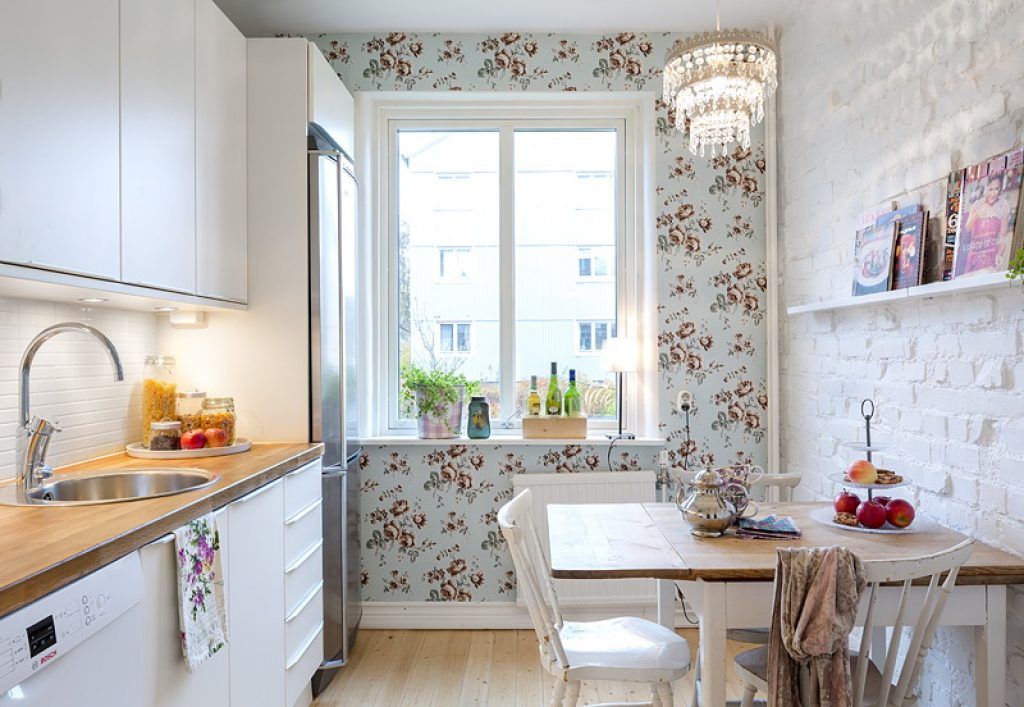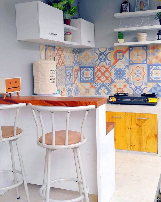Cu toate acestea, iti recomandam sa nu te feresti de culori mai indraznete. Foloseste pe portiuni mici, cum ar fi in zona dintre corpurile de mobilier (cu placi ceramice tip patchwork) sau chiar la dulapurile din zona inferioara. Ai putea incerca cu un tapet pe care sa-l integrezi pe partea cu masa sau de ce nu la fereastra (vezi modelul din galerie).